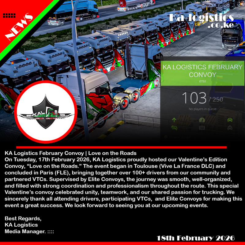 On Tuesday, 17th February 2026, KA Logistics proudly hosted our Valentine’s Edition Convoy, “Love on the Roads.” The event began in Toulouse (Vive La France DLC) and concluded in Paris (FLE), bringing together over 105+ drivers from our community and partnered VTCs.